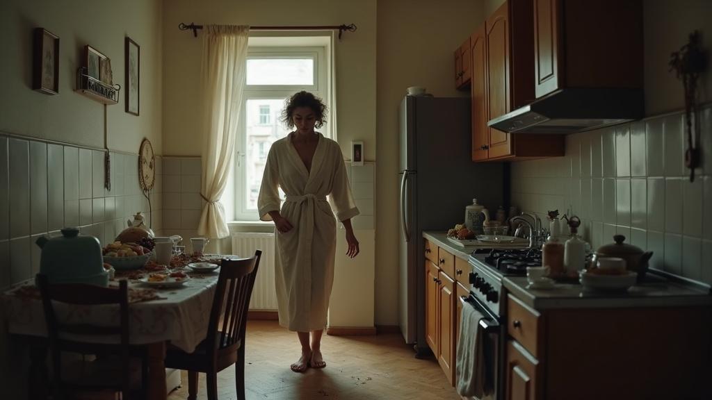 Ioana Popescu a ieșit pe coridor, strângându-și în fugă cordonul halatului. Pe masă stătea un borcan deschis de maioneză, pâine, brânză aruncată direct pe blat și un cuțit cu urme albe și grase. În chiuvetă — căni și linguri.