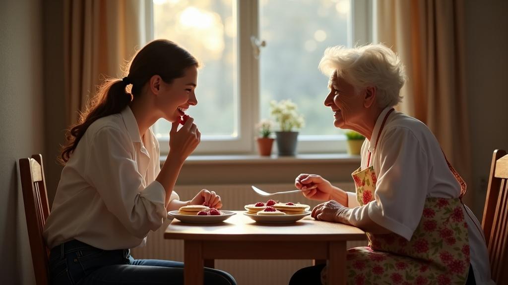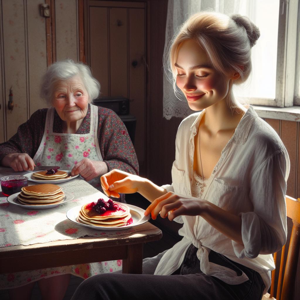 — Inima mea simțea că vei trece pe la mine. Și clătite am copt dis-de-dimineață. Hai, dezbracă-te, spală-te pe mâini și vino la masă!